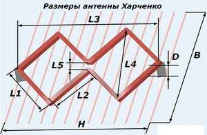 Особливу роль відіграють конфігурація і розміри поперечного перерізу. Рекомендується споруджувати антену Харченко з дроту з поперечним перерізом не менше 5 мм ² і діаметром 2,5 мм, так як ці параметри, згідно з народним досвіду, найбільш сприятливі. Відразу варто обмовитися, що допускається брати товщину 2,3 мм з перетином 4 мм ², яка неістотно зменшить характеристики прийому. Якщо буде потрібно, то допустимо здійснити монтаж з перетином 2,5 мм², але це вже зіпсує якість сигналу, підвищить його згасання. Хоча для будь-якого конкретного випадку або місцевості це може бути цілком можливо – слід підходити індивідуально.