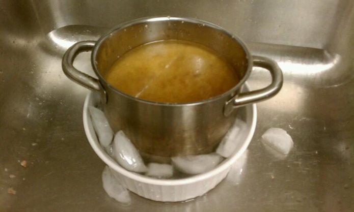 Якщо об'єднати рекомендації виробників і кухарів, вийде, що блюдо слід остуджувати, але робити це потрібно швидко. Прискорити процес вийде за допомогою тазика з холодною водою (або з льодом). Помістіть в цю ємність каструлю з блюдом, вона охолоне на 30% швидше (тільки якщо не станете міняти холодну воду кожні 15 хвилин).