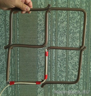 Тепер верхні частини рамок потрібно з'єднати, а до закріплених на виведення антени мідним або латунним пелюсток підключити кабель.