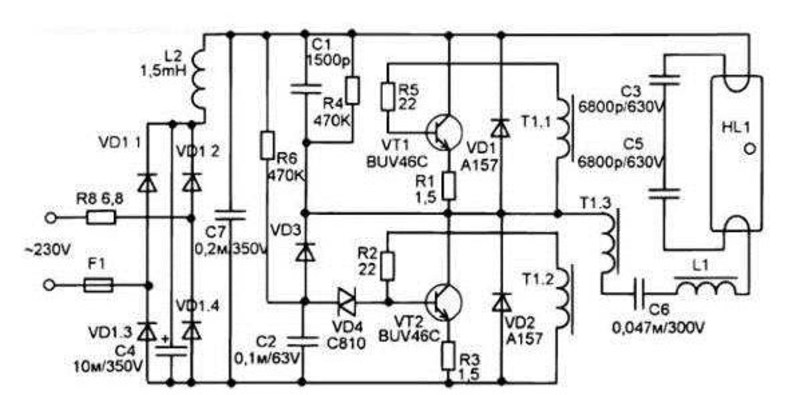 Сьогодні великого поширення набули компактні люмінесцентні пристрої з цоколем Е14 і Е27.У них баласт встановлюється безпосередньо в конструкцію приладу. Приклад схеми електронного баласту для люмінесцентних ламп 18w наведено нижче.