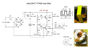 Всі такі трансформатори зроблені за однією схемою, відмінності між ними мінімальні. В основі схеми лежить симетричний автогенератор, інакше званий мультивібратором.