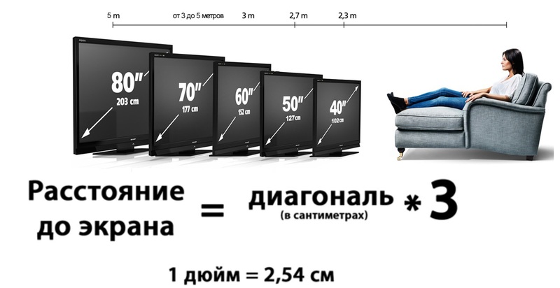 Саме з розміру пристрою і починається вибір нового ТВ. Багато хто вважає, що варто купувати телевізор з максимально великою діагоналлю, на який вистачає виділених коштів. Однак це не зовсім правильний підхід. Кілька років тому вважалося, що оптимальною відстанню від глядача до екрана є 3-4 діагоналі апарату, а останнім часом говорять уже про 23 диагоналях. Слід розуміти, що ця рекомендація носить умовний характер.