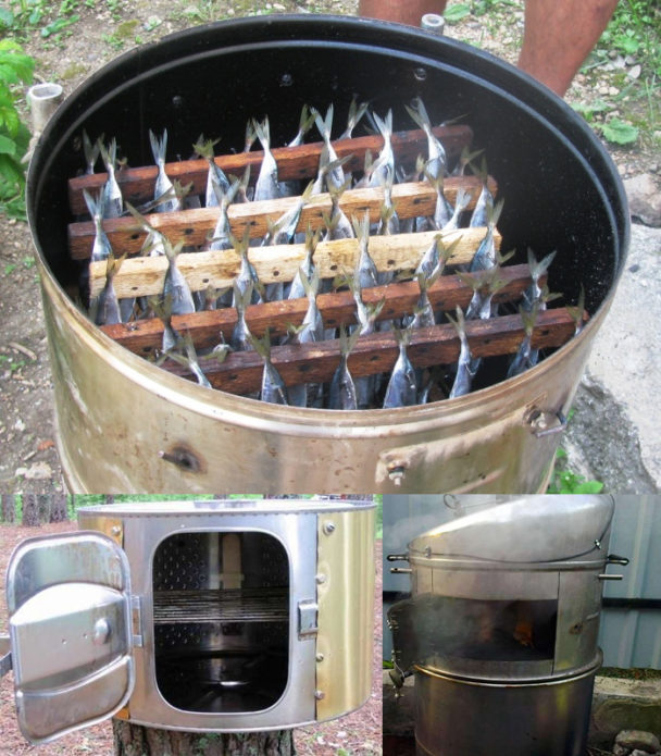 Для міні-коптильні використовують корпус, бак і барабан машини. Дим легко проходить через перфоровану сталь і рівномірно розподіляється всередині контейнера.