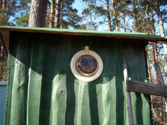 Завантажувальний люк машини можна використовувати як вікно-ілюмінатор. Таке віконце прикрасить гараж, майстерню, лазню та дитячий ігровий будиночок. Вікно роблять відкривається або глухим, використовують обидві частини люка або одну.