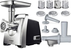 Продукція фірми Bosch – це поєднання якості і ціни. Хоча штовхач, корпус і лоток для м'яса виготовлені з пластику, деталі досить міцні і витримують великі навантаження. Пристрій не ковзає по поверхні столу, адже його ніжки покриті гумовими накладками. Місце для мережевого шнура і решіток знаходиться всередині конструкції, зручна ручка дозволяє легко переміщати прилад в інші кімнати.