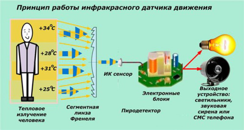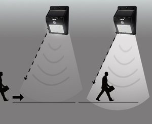 Датчик, що спрацьовує на рух, який вбудований в конструкцію лампи, реагує на все переміщення в радіусі своєї дії. Він працює в інфрачервоному діапазоні і вловлює будь-які зміни фону випромінювання. Якщо в зоні дії приладу з'явиться живе або неживе тіло, яке випромінює тепло, то апарат спрацює і автоматично включить світло.