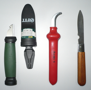 - Проробивши надріз потрібної довжини, ніж отримують, провідники звільняють від зовнішньої оболонки, яка видаляється за допомогою ріжучої кромки на лезі.