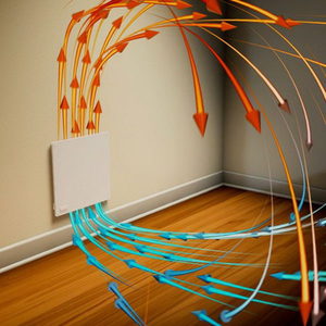 Конвектори споживають невелику кількість електроенергії. Нагрівальний елемент в них нагрівається до 80 ° C і все тепло повністю віддається холодному повітрю. Принцип роботи таких обігрівачів заснований на природній конвенції. Тобто теплий потік повітря піднімається вгору, а за собою затягує холодний. Процес воздухозамещенія протікає постійно.