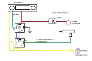 Часто водій думає, відключив я музику в машині чи ні на стоянці. Принцип полягає в тому, що магнітола відключається і включається від сигналізації. Такий спосіб також зменшує витік струму, так як при включеній сигналізації магнітола відключена від харчування. Для підключення потрібно два п'яти контактних реле і пару діодів. Більш детальну схему можна знайти в інтернеті саме по своєму автомобілю, сигналізації і магнітоли, так як в різних авто своя колірна гамма проводів.