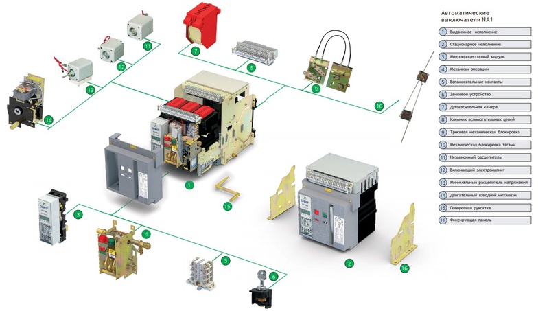 Захисні конструкції володіють декількома компонентами, розміщеними всередині або зовні автомата. У їх числі всілякі расцепители і контакти, приводи для віддаленого контролю, сигналізаційне обладнання і датчики автоматичного відключення.