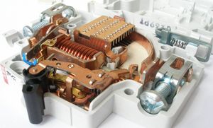 Пристрій складається з котушки соленоїда і сердечника, який фіксується за допомогою невеликої пружини. При виникненні непередбаченої стрибка напруги починає рости магнітна індукція. У зв'язку з цим відбувається моментальне розмикання контактів, а подача електроструму в захищається ділянку припиняється. Електромагнітна деталь включається за кілька мілісекунд і перешкоджає запаленню ізоляції.