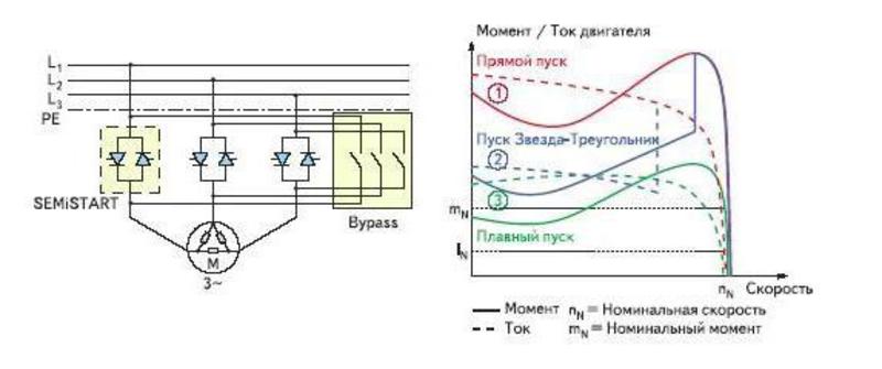Завдяки застосуванню сімісторов з'являється можливість знизити пускові струми в 2 і більше разів, а наявність контактора дозволяє уникнути перегріву сімісторов (на малюнку 2: Bypass). Основні недоліки симісторних УПП: