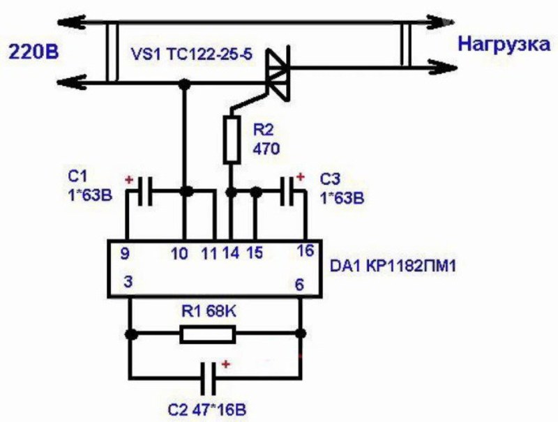 Цю схему для регулювання обертів електродвигуна можна модернізувати шляхом заміни R1 на змінний резистор. При зміні величини опору змінного резистора змінюється потужність електромотора. Резистор R2 виконує функцію контролю величини сили струму, який протікає через вхід симистора VS1 (бажано передбачити охолодження вентилятором), що є керує. Конденсатори С1 і С3 служать для захисту і управлінням мікросхеми.