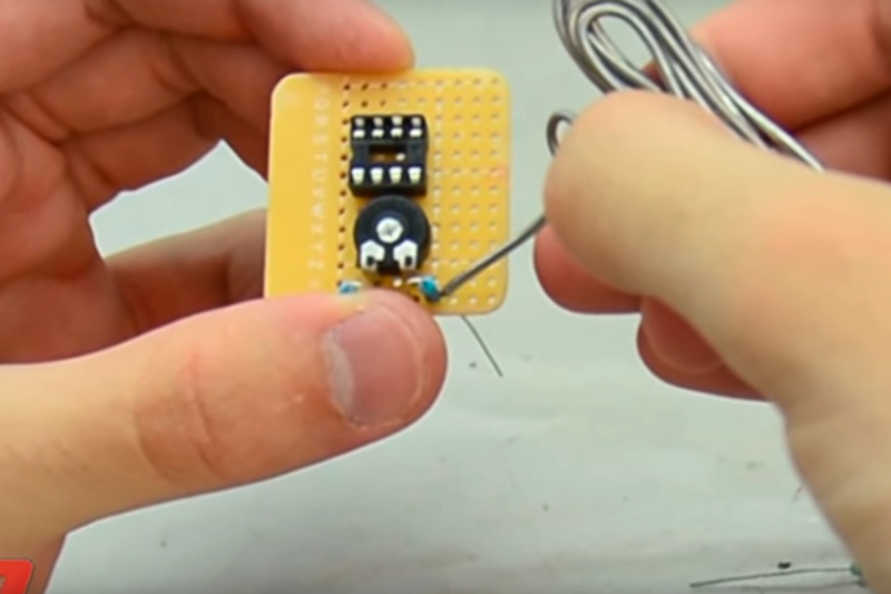 На базі транзистора збирається генератор слабких коливань.- Потім приєднується фільтр низьких частот і конденсатор. Завдяки їм імпульс буде надходити на контакти сигналізації.