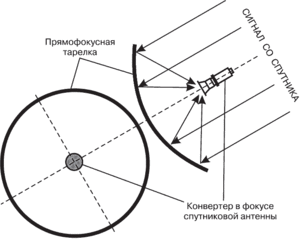 Параболічна форма офсетного тарілки відображає надходить сигнал до антени, закріпленої в центрі конструкції. На координатора тарілки закріплений автоматично настроюється рупорний опромінювач. Ця деталь є підсилювачем сигналу. Передні головки конвектора здійснюють відбір радіохвиль від фокусної точки, З передачею блоку понижуючого перетворення. Роль рупора полягає в перетворення радіохвиль і електромагнітних сигналів в електричні. Додатково здійснюється настройка їх спектра. Сигнал з конвектора потрапляє на ресивер, а далі на телевізор.