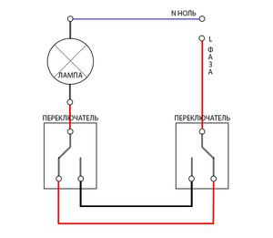 Нуль підключений до лампочки, і чіпати його не треба. Працюємо тільки з фазою. До першого вимикача ток підходить по одному дроту.З другого перемикача він теж йде по одному дроту. А ось між ними маємо два дроти.