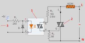 Застосування оптичної пари МОС3083 дозволяє формувати керуючий сигнал, вхідна напруга якого знаходиться в діапазоні 5-24 В. Щоб продовжити термін роботи світлодіода АЛ307, в схему введена ланцюжок, що складається з опору і стабілітрона. Знайти всі електронні елементи буде нескладно. Зібрана схема в обов'язковому порядку перевіряється на працездатність.