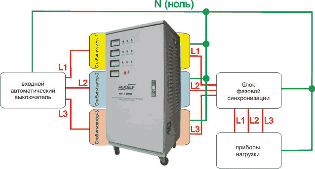 При наявності трифазного харчування потрібна установка відповідного приладу. Складність стабілізації одночасно трьох фаз обмежує тип функціонального виконання. Дані пристрої засновані на релейному або тиристорному перемиканні обмоток трансформатора. Суперечка про те, який краще, тиристорний або сімісторний, безглуздий, оскільки симистор різновид тиристора і в роботі між ними немає абсолютно ніякої різниці.
