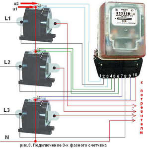 Трифазні лічильники такого способу включення вимагають наявності в ланцюзі трансформатора обліку. Подібне обладнання можна застосовувати в високопотужними електросхемі. При фіксації спожитої електроенергії необхідно знати індекс трансформації використовуваного перетворювача.