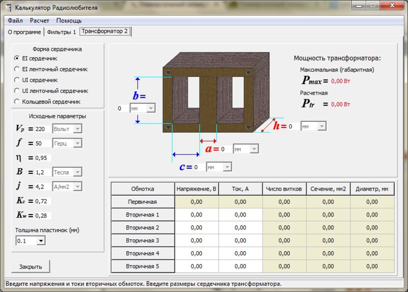 Для виготовлення Т необхідної потужності слід виконати розрахунок самостійно.Якщо відомо U і максимальний I, який має генерувати КВО, то P вторинному ланцюзі розраховується за такою формулою: P2 = U2 * I2. При коефіцієнті корисної дії (ККД = 0,8) Т потужність КПО обчислюється таким способом: P1 = P2 / 0,8 = 1,25 * P2.