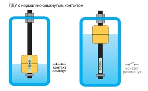 Шток поміщається в направляючу трубку, До бічної поверхні трубки на рівнях включення і виключення обладнання кріпляться геркони. Потрібно пам'ятати, що конструкція не повинна реагувати на дію магніту. Верхній геркон повинен мати нормально розімкнуті контакти, нижній – нормально замкнуті. При проходженні магнітом геркона у нього спрацьовують контакти і управляють котушкою магнітного пускача. На вхідні силові контакти пускача подається напруга, до них підключається двигун.