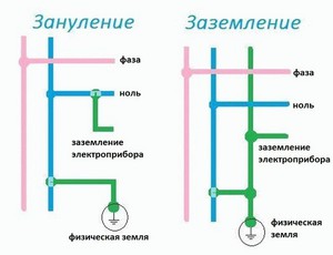 - при заземленні надлишковий струм відводиться в землю, а при виконанні занулення напруга скидається в щитку на нуль;