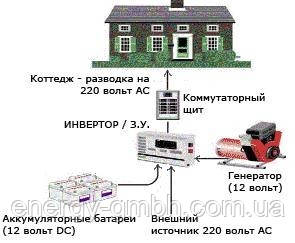 - Застосування енергії з акумуляторів, яка зберігається у формі постійного струму, для живлення пристроїв, що працюють на змінному струмі.